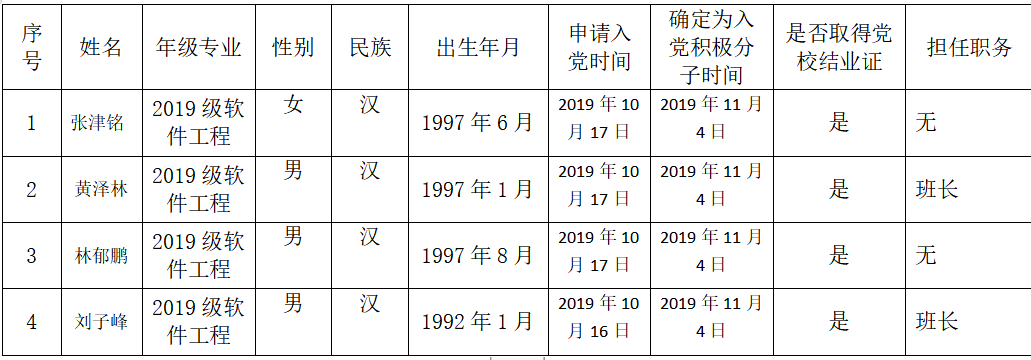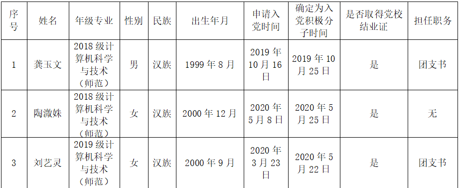 经盈丰娱乐 计算机科学与技术(师范)一党支部培养考察,在听取党小组、培养联系人、党员和群众意见的基础上,经党支部(或支委会)讨论,确定龚玉文等3同志为发展对象。现根据学校发展对象备案制度进行公示,公示期为202...