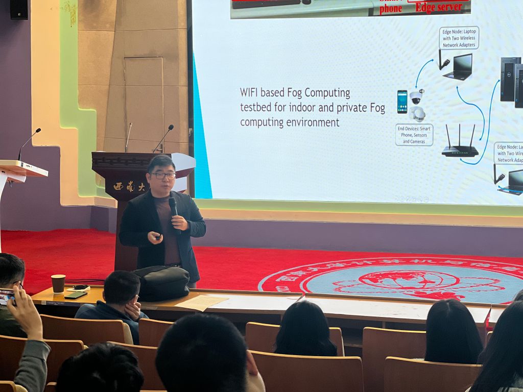 会上,刘晓副教授介绍了软件工程创新实验室正在开展的研究工作、已取得的成果和未来研究规划。他在展示丰富研究工作的同时,也表达了同西南大学师生就共同感兴趣的研究领域开展研究合作的意愿。聚焦边缘智能系统的体系架构、工作流调度方法、工作流仿真系统和相关系统工程方法在无人机物流配送领域的应用研发,他阐述了边缘智能系统工程方法中所蕴含的科学技术问题及其研究工作内容,也根据自身的经验介绍了如何在新的研究领域开启一项新的研究工作的方法,即以新领域的具体案例为驱动,开展具体的工作;再以具体工作成果为实验和验证的平台,分享并吸引合作者在其上开展广泛而深入协作研究;最终形成体系化的研究工作框架。