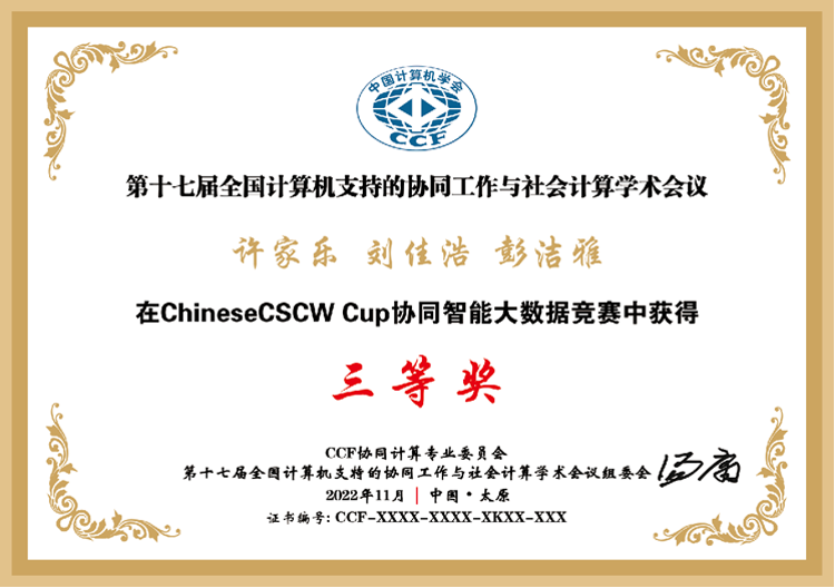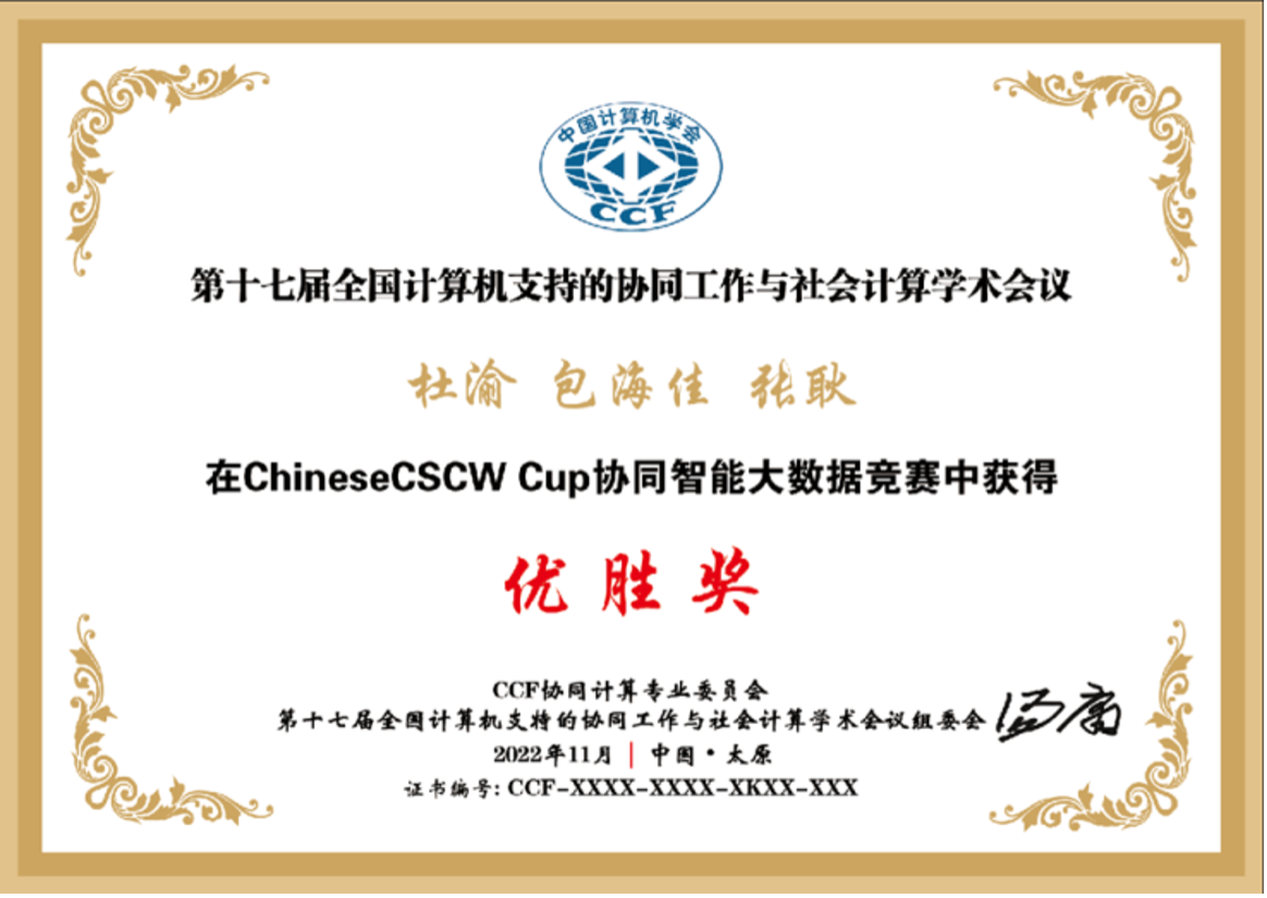 近日,由中国计算机学会(CCF)协同计算专委会组织的ChineseCSCW2022协同智能大数据竞赛在山西太原成功举办,我院“复杂系统与交叉科学应用”团队研究生组建的三支参赛队伍分别获得一等奖、三等奖和优胜奖。“复杂系统与交叉科学应用”团队已连续2年包揽此项比赛的一等奖(去年报道见//yingfengyl.net/info/1040/1800.htm),展现了团队在社会计算领域的研究实力。