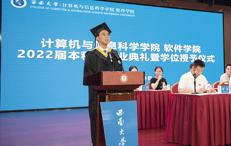 2018级软件工程专业学生宋行健代表毕业生发言,他在发言中讲到,在西南大学的四年时光美好又短暂,在这期间与同学们共同祝福祖国生日华诞,作为志愿者一起参与抗击新冠疫情,也一起迎接了冰雪冬奥,这些都组成了大家丰富多彩的大学生活。同时,在学校期间,盈丰娱乐