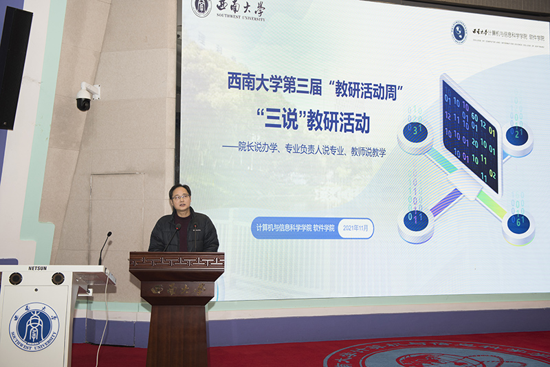 第三届“教研活动周”实施计划》等文件要求,我院于2021年11月19日下午14:30,在25教1楼报告厅召开全体教职工大会,围绕“院长说办学、专业负责人说专业、教师说教学”的主题开展了教育教学“三说”活动。活动由盈丰娱乐