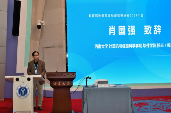 院长肖国强教授现场致辞。杜小勇教授对与会来宾表示诚挚的欢迎和衷心的感谢。他表示建设虚拟教研室是响应教育部新时代教育改革需求的重要举措,旨在通过资源共享与合作研究推动数据库教学的全面进步。他希望通过本次年会,能够促进数据库领域专家学者之间的经验交流,共享课程建设的丰富资源。