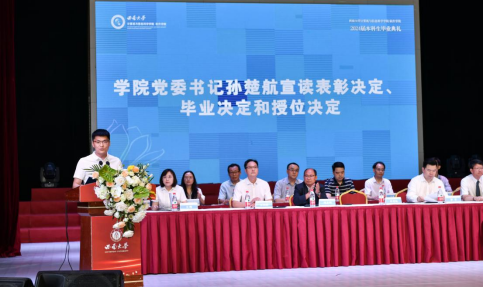 教师代表,自动化系主任范子川老师回顾了与学生们在计信院共同经历的成长历程,强调了在智能时代不断学习和探索的重要性。他鼓励毕业生们怀抱爱国之心,永葆求知之心,养就淡然之态,在未来的道路上坚定前行,勇于创新,积极应对挑战,成就更加光辉灿烂的未来。