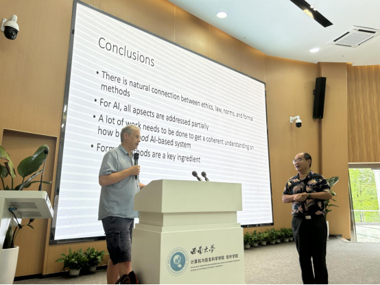 于6月29日上午举办【弘毅零一】学术报告会,德国吕贝克大学Martin Leucker教授受邀来院讲学,就“Development of AI-based software systems”作主题报告。报告会由西南大学软件研究与创新中心(RISE)主任刘志明教授主持,全院近百名师生参会。