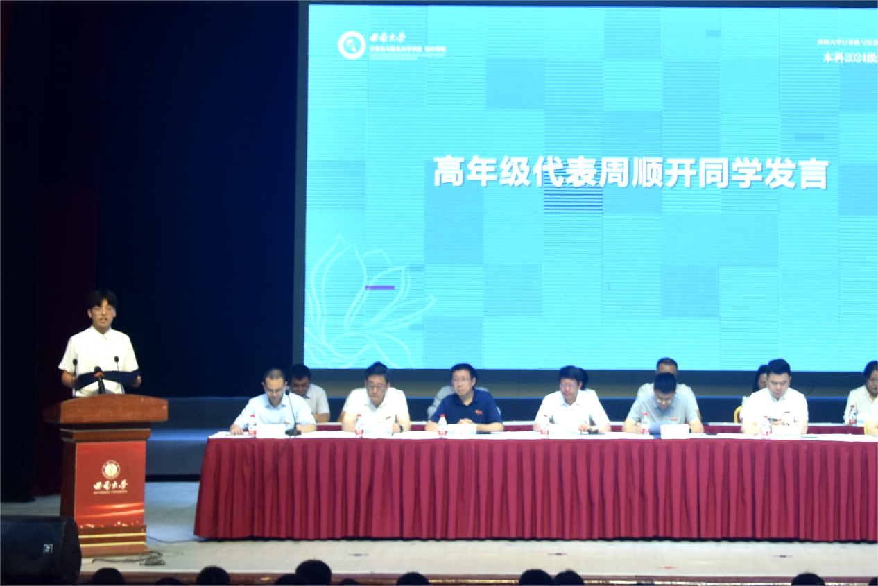 2021级自动化专业周顺开同学发言,他结合自身经历与在场新生分享自己的学习、科研、生活经验,为学弟学妹们提供切实建议,鼓励大家勇敢尝试,拒绝等待;坚持自律,拒绝懈怠;开放交流,拒绝封闭,努力成为“敢为人先,勇毅前行”的计信青年。