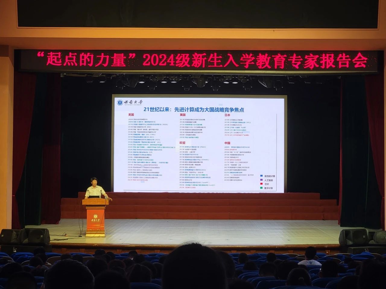 张自力教授在光大礼堂为全体新生开展“新形势•新挑战•新思维”专题讲座。张自力老师以“Why your future is glorious?”这一振奋人心的提问拉开序幕,向2024级新生深入剖析了计算机、人工智能等高科技正在加速推动人类社会向智能化迈进的全新形势。张自力老师从当前世界百年未有之大变局的形势出发,为同学们分析了新形势下我们所面临的新挑战。他希望同学们锻造适应新时代需求“六大必备能力”:设计感、故事力、交感力、共情力、娱乐感、意义感,鼓励同学们追求有价值的成功。最后,张老师满怀激情地寄语新生:一是远离无谓的内卷,实现从自我迭代的“in•volution”向全面进化的“e•volution”转变;二是要坚持科技创新与人文素养并重,培养全面发展的自己,成为既有硬核科技实力,又具备深厚人文素养的新时代青年。