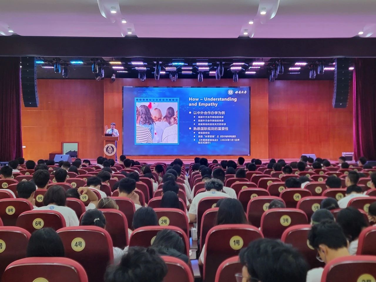 近年来在中外合作办学领域取得的丰硕成果,生动展示了联合培养平台为学生搭建起通往世界的桥梁,让学术资源跨越国界,实现共享与融合的有效作用。张老师结合个人在国际合作办学领域的丰富经验和深刻洞察,鼓励学生们要敢于走出舒适区,积极拥抱多元文化,通过参与国际项目、交流访问等方式,拓宽视野,增长见识。他希望同学们充分利用国际化教育高地的独特资源与优势,勇于探索未知领域,敢于挑战自我,在跨文化交流中碰撞思想火花,汲取智慧养分。