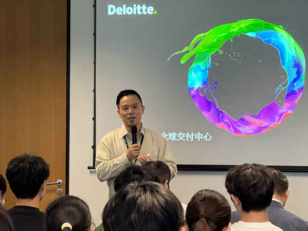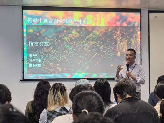 抵达德勤咨询公司大楼后,同学们首先参与了企业宣讲会。宣讲会由校园招聘经理孙业鹏主持,德勤中国咨询全球交付中心领导合伙人王华、德勤中国咨询全球交付中心总监张峰华系统介绍了德勤的发展历程、核心业务、行业布局与人才培养体系,这让同学们对咨询行业、数字化服务及前沿技术应用建立了初步的全面认知。
