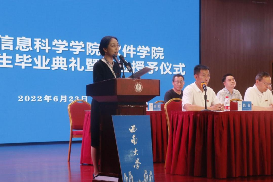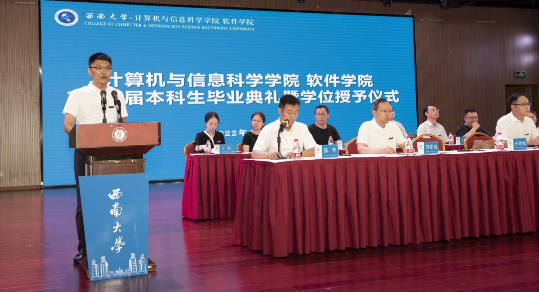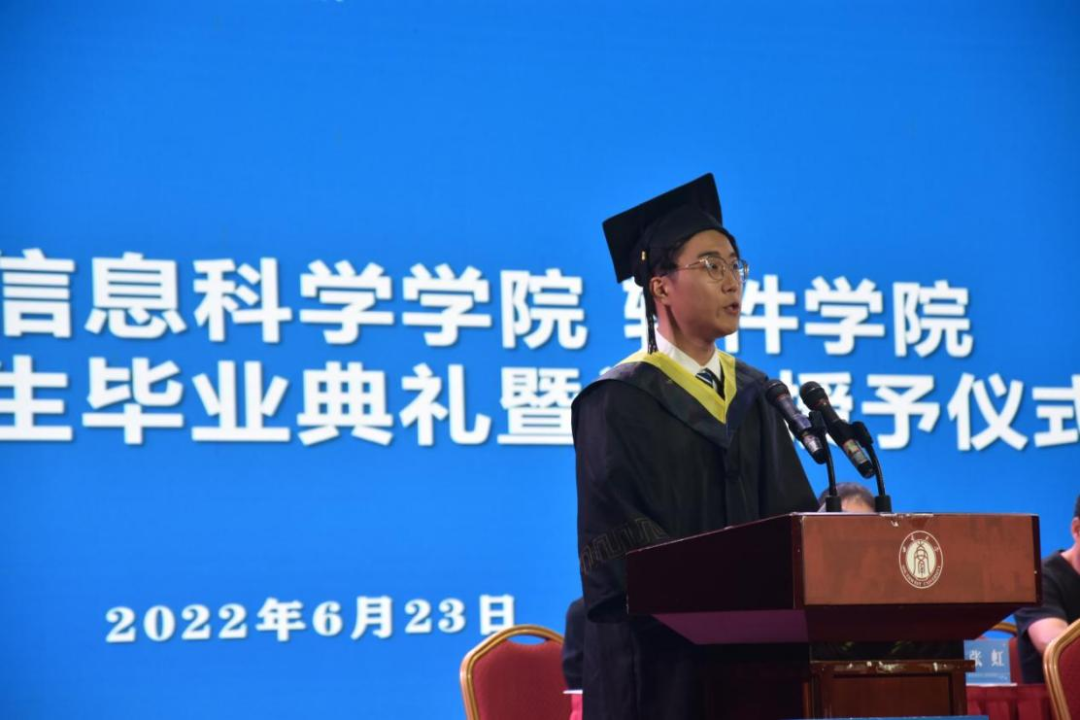 2018级软件工程专业学生宋行健代表毕业生发言,他在发言中讲到,在西南大学的四年时光美好又短暂,大学生活丰富而多彩,盈丰娱乐