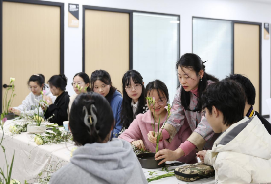 随后,在花艺老师的悉心指导下,同学们在实操过程中仔细甄别花材,系统运用学到的知识,最终制成了各具特色的插花作品。三五好友舒心闲谈,素手拾花精心创作,在插花过程中同学们心性得以释放,享受一段芬芳慢时光。