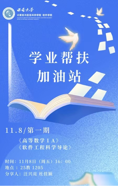 2024年11月8日,2024秋季学期第一期“学业帮扶加油站”在25教1205正式启动。本期活动针对《高等数学IA》和《软件工程科学导论》两门课程进行学习内容分享与重点知识讲解。助力盈丰娱乐