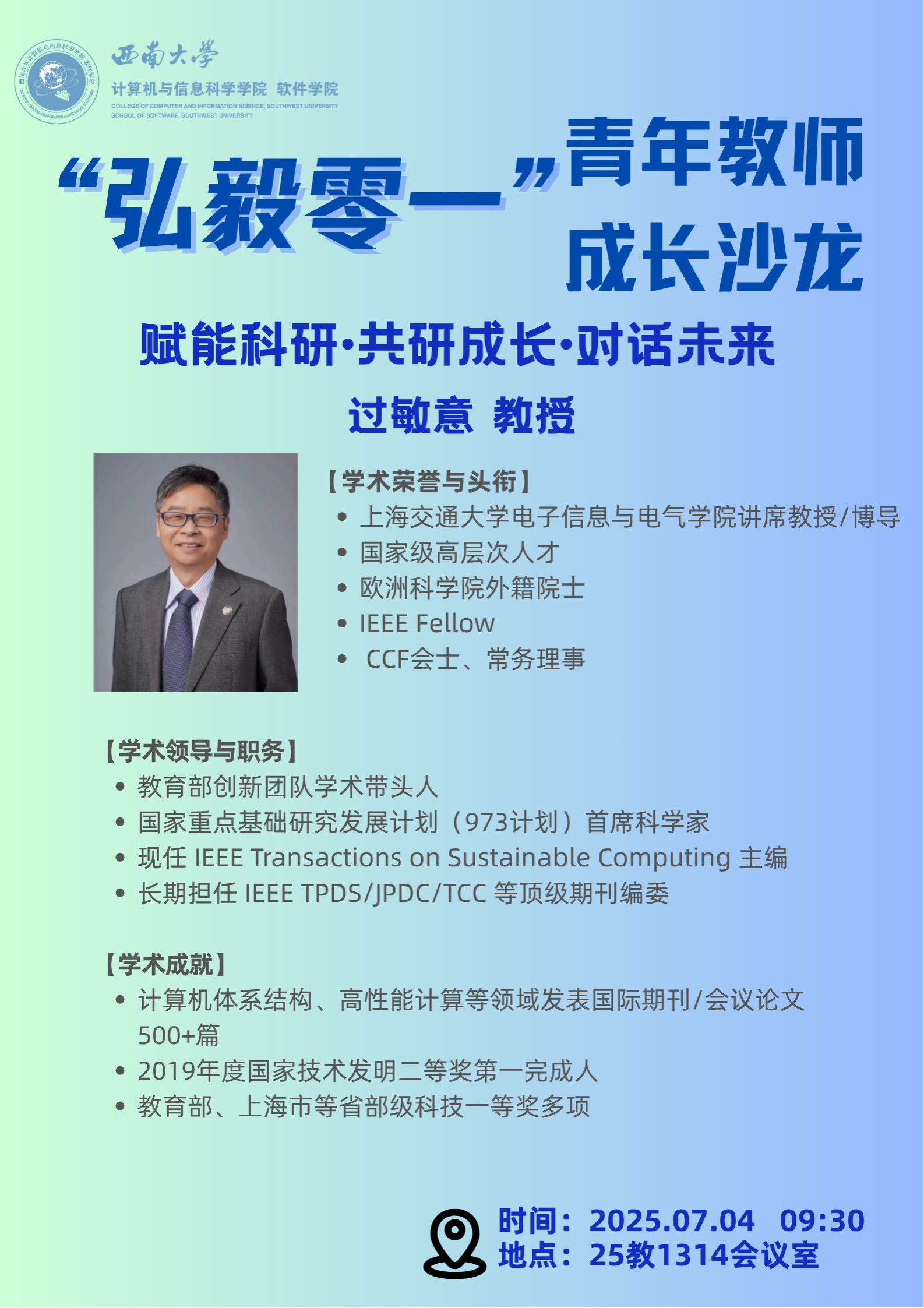 外籍院士,IEEE Fellow,中国计算机学会会士、常务理事。担任教育部创新团队学术带头人,973计划首席科学家。现任IEEE Transactions on Sustainable Computing主编,并长期担任包括IEEE TPDS、JPDC、TCC等国际著名期刊的编委。他在计算机体系结构、高性能计算等领域的重要国际学术会议和国际期刊上发表了超过500篇论文。以第一完成人获2019年度国家技术发明二等奖和教育部、上海市等省部级科技一等奖多项。