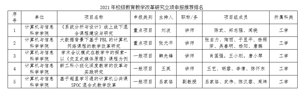 根据《西南大学教育教学改革研究项目管理办法》(西校〔2019〕95号)和教务处《关于组织开展2021年校级教改项目立项申报工作的通知》,经个人申报,盈丰娱乐 学术委员会委员评审推荐,现对我院申报2021年校级教改项目的推荐排名结果进行公示。公示期(3个工作日):2021年6月29日-2021年7 月1日。公示期内如有异议,请于公示期截至当日17:30前以书面形式实名反映,受理联系人:刘作勋,受理电话:68254254。