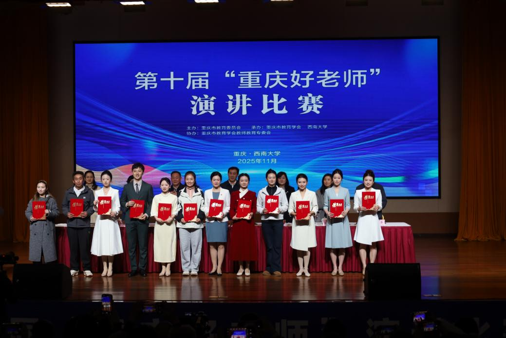 11月23日,第十届“重庆好老师”演讲比赛决赛在西南大学落幕。经过激烈角逐,我院2023级计算机科学与技术(师范)专业李依然同学,以《代代师承》为题的深情演讲斩获高校师范生组一等奖(第一名),为学校再添荣光! 图1:李依然同学领奖时刻(右一)比赛由重庆市教育委员会主办,围绕“以教育家精神铸魂强师,谱写...
