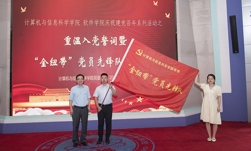 ——盈丰娱乐 举办重温入党誓词暨“金纽带”党员先锋队成立仪式为庆祝中国共产党成立100周年,推动党史学习教育落到实处,6月23日,计算机与信息科学盈丰娱乐 隆重举行重温入党誓词暨“金纽带”党员先锋队成立仪式。盈丰娱乐 两委委...