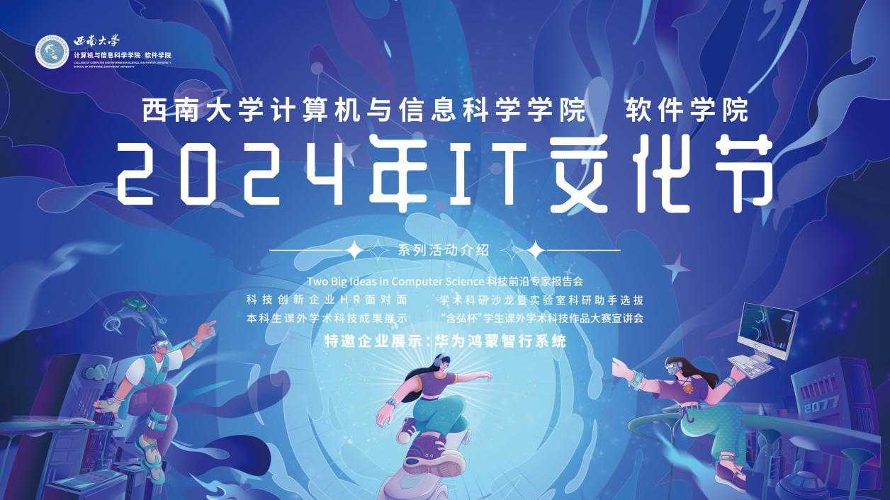 2024年11月29日下午,西南大学盈丰娱乐 2024年IT文化节在25教1楼学术报告厅落下帷幕。本届“IT文化节”是一场精心打造的科技盛宴,由科技前沿专家报告会、科技创新企业HR面对面、本科生课外学术科技成果展示、学术科研沙龙暨实验室科研助手选拔、“含弘杯”学生课外学术科技作品大赛宣讲会五大环节...